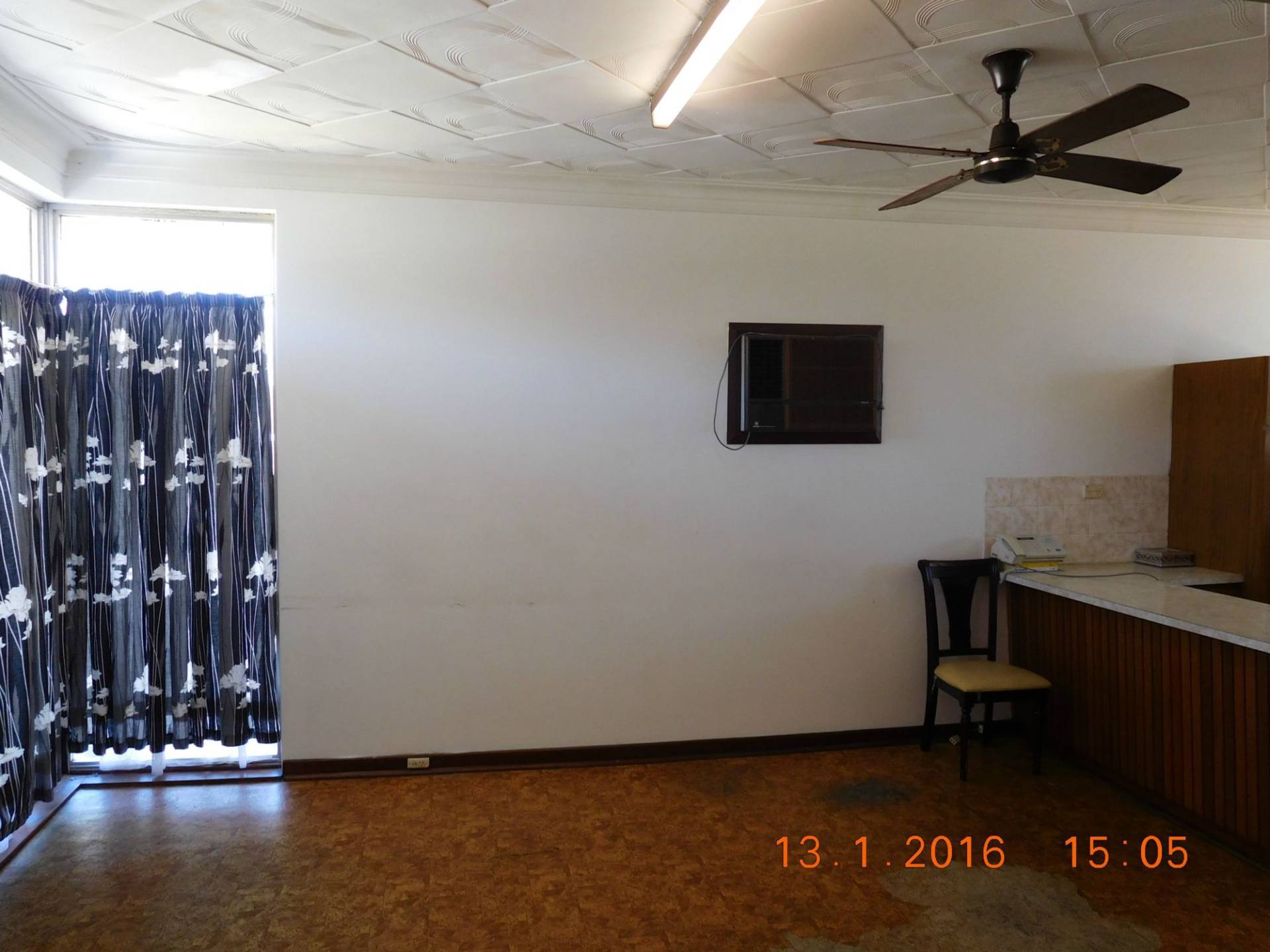 - Kitchen/living area with fire place and air con unit.