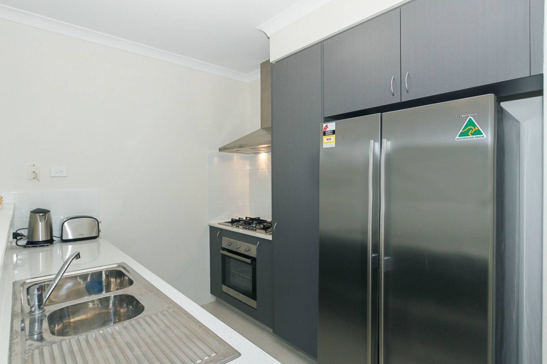 - Modern kitchen with stone bench tops and stainless steel appliances.