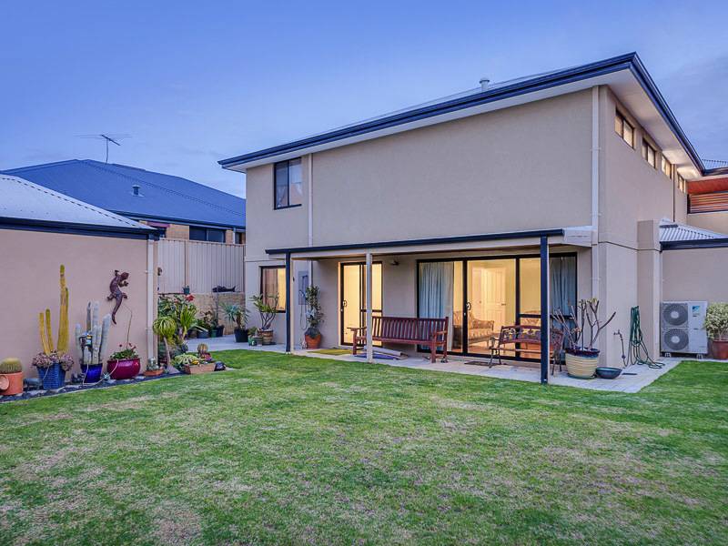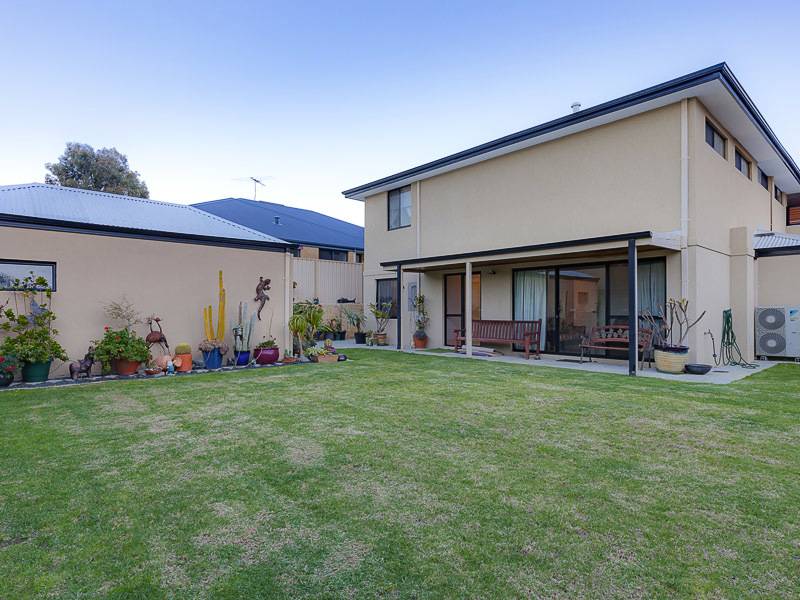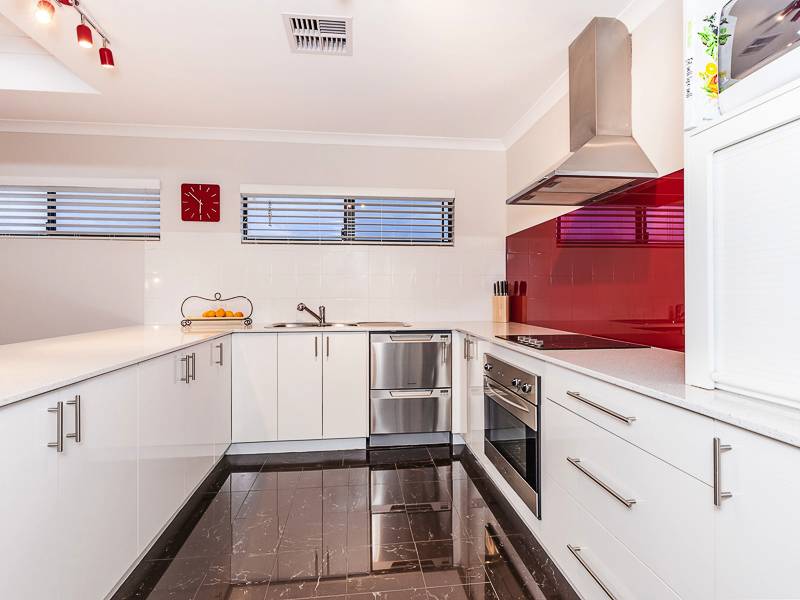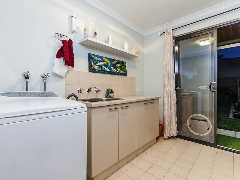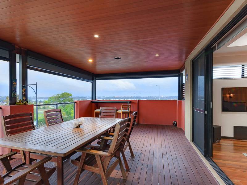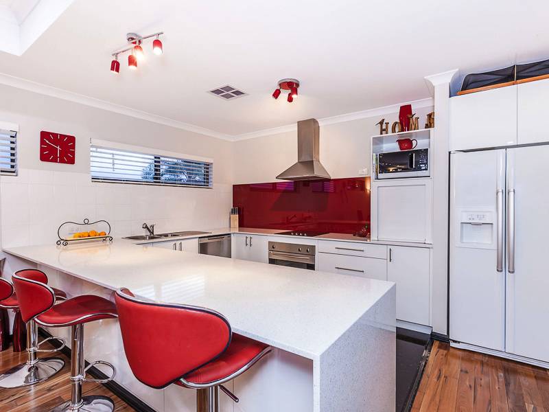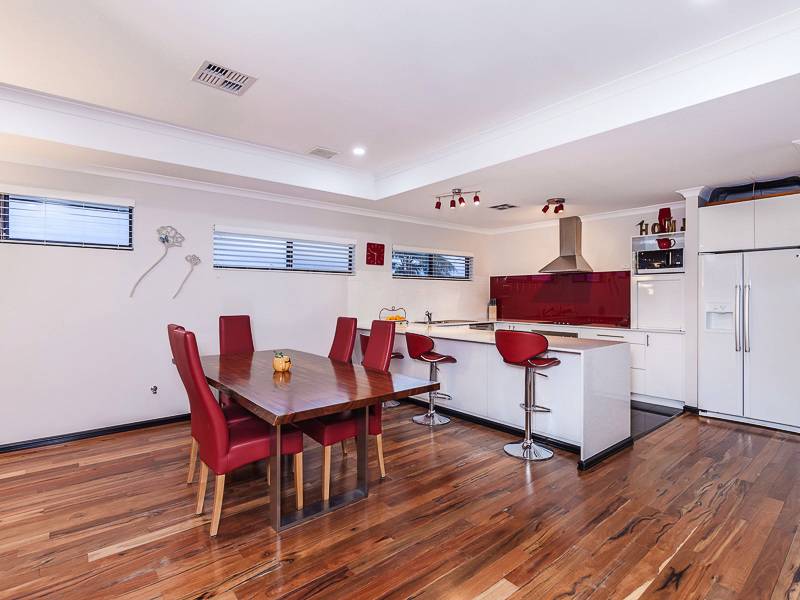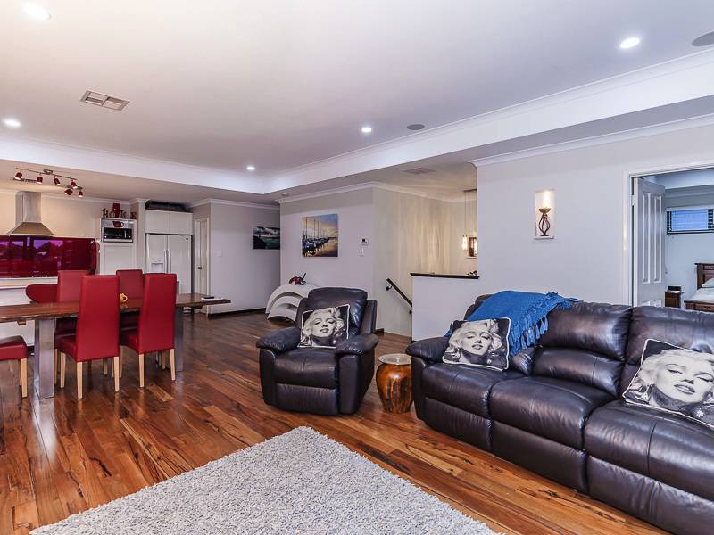 Large open plan living, dining with Marri floorboards and kitchen with stone bench tops, glass splash back, appliance nook, massive walk in pantry and breakfast bench all overlooking the cedar-lined balcony with stunning views of Lake Joondalup.