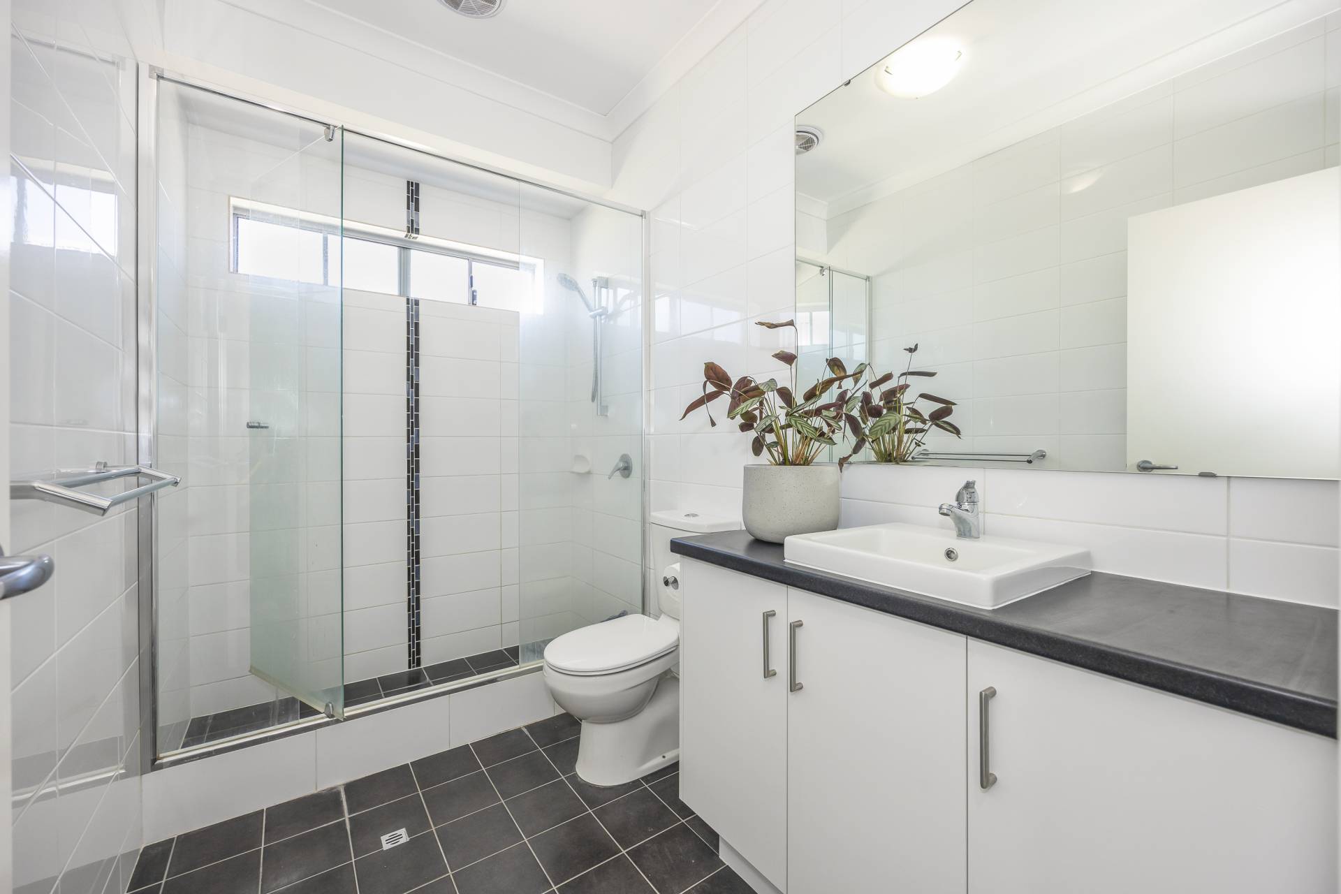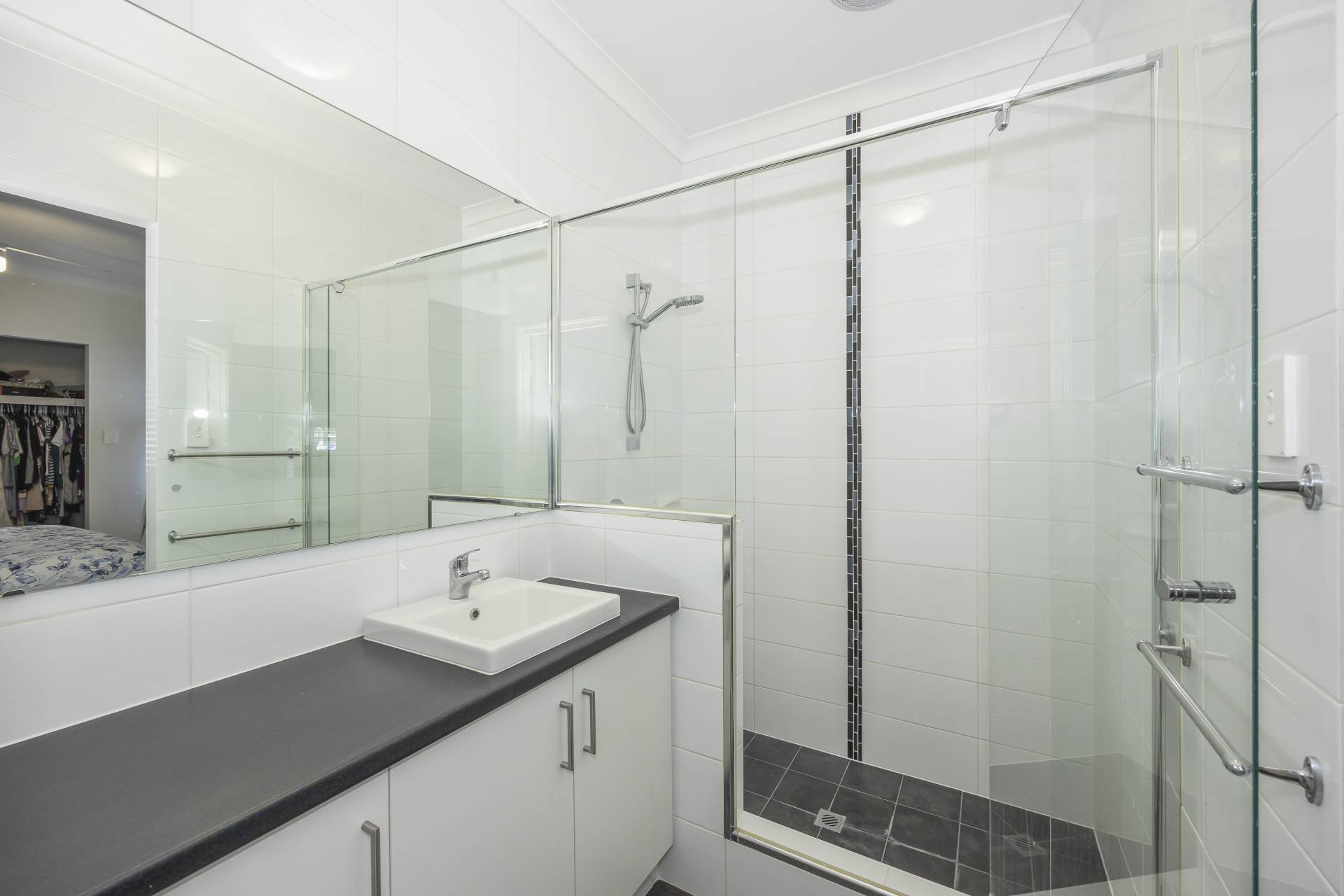 - Modern, neutral toned bathroom and laundry.