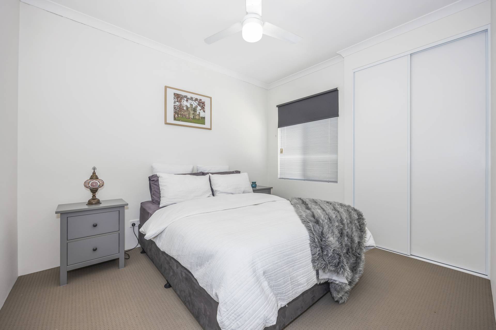 - 2 minor carpeted bedrooms with ceiling fans and BIR's.