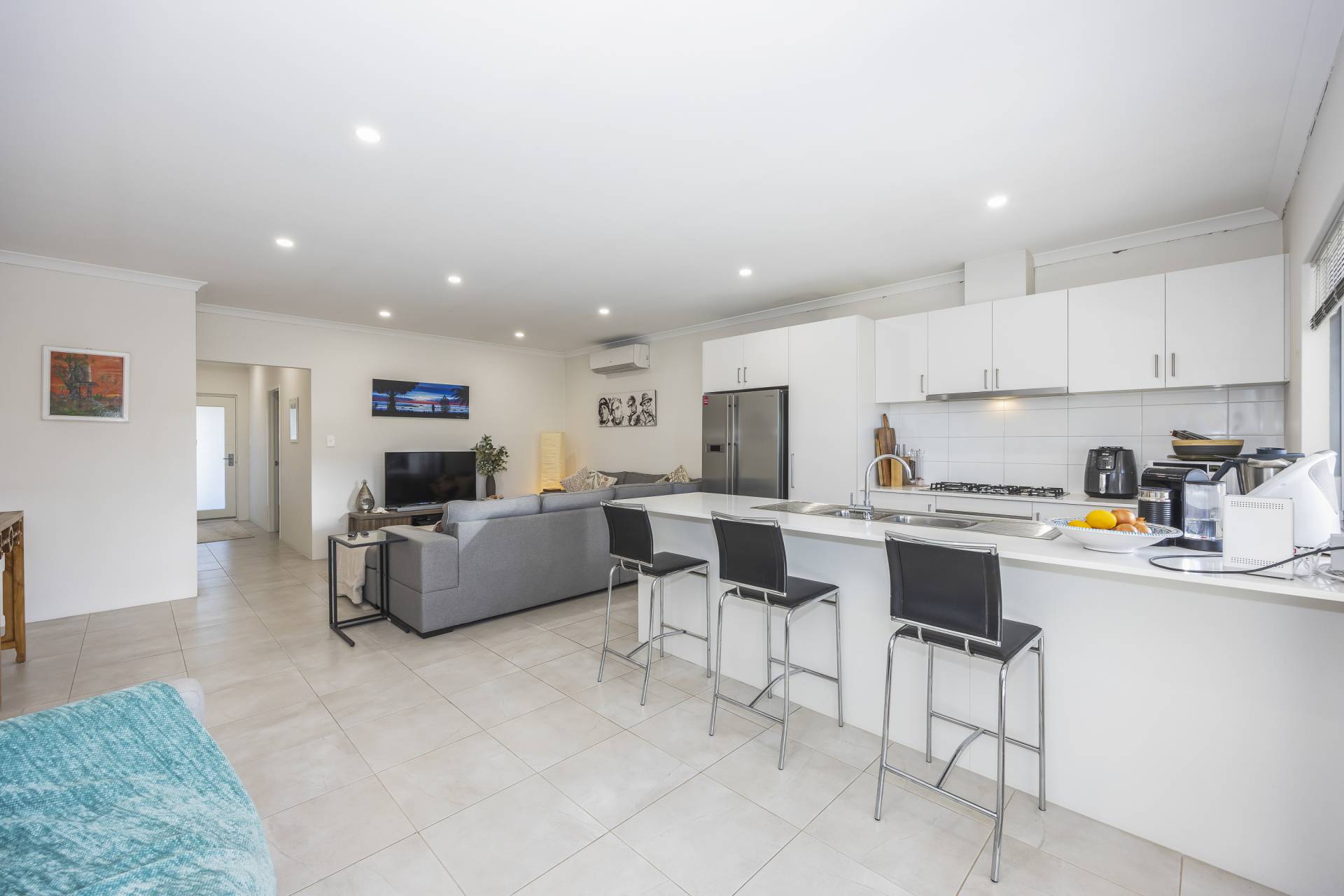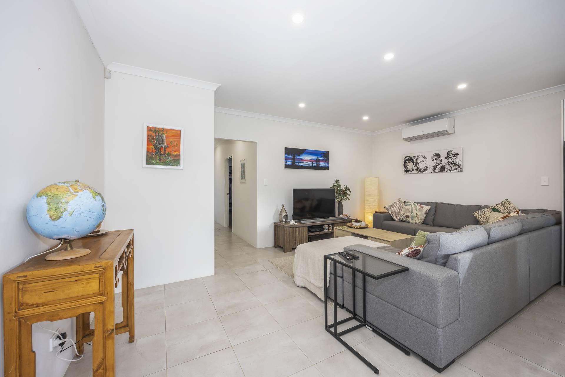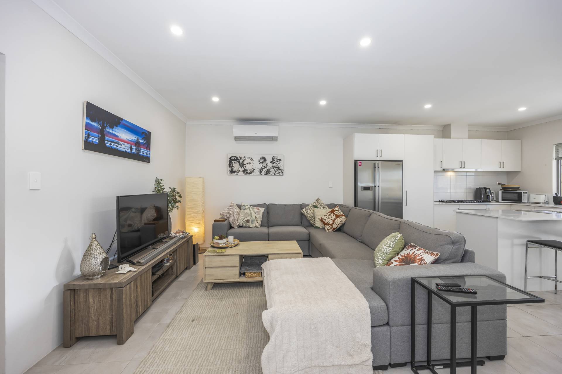 - Open plan tiled living area with high ceilings, LED down-lights and split system air conditioner.