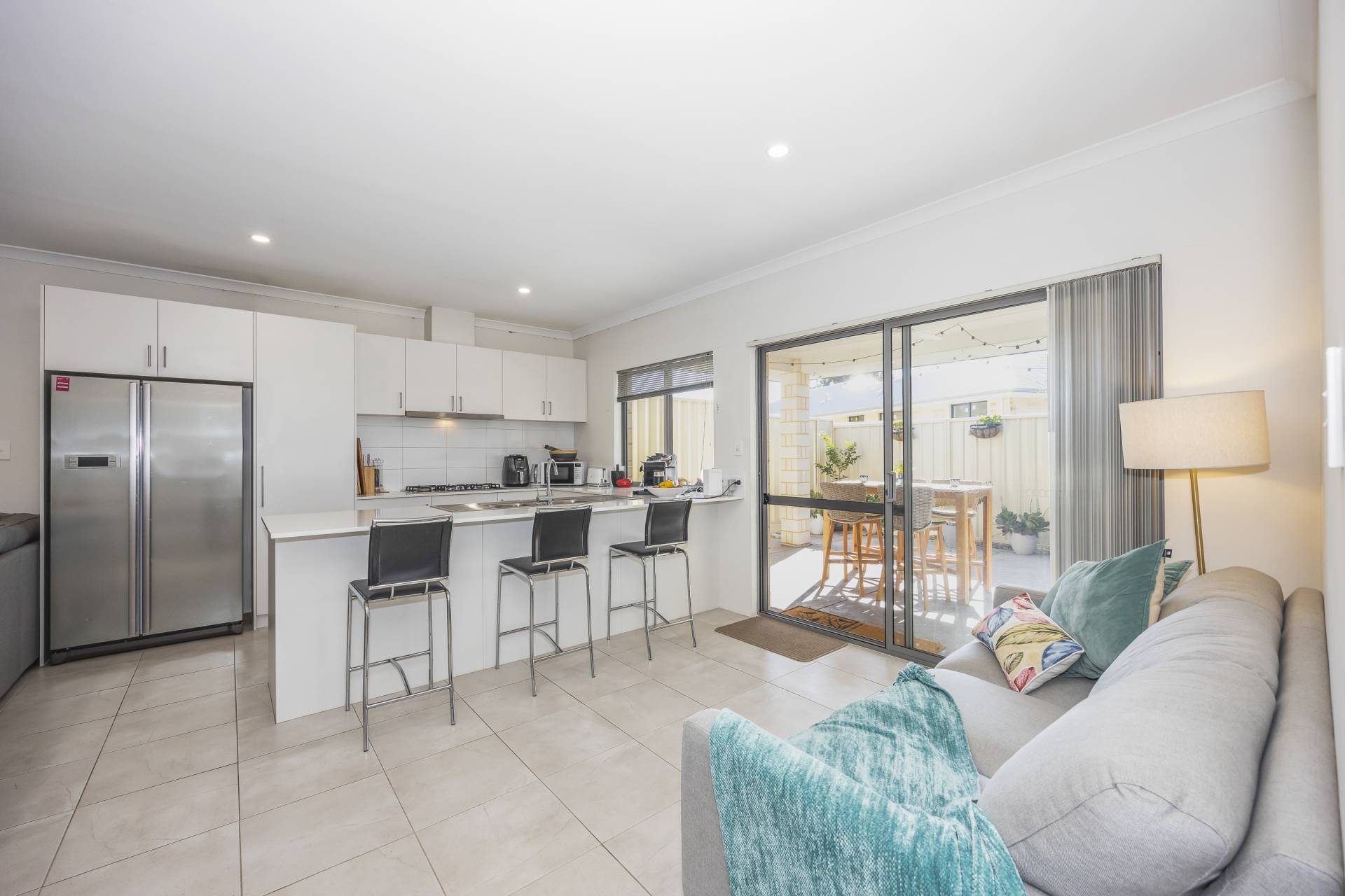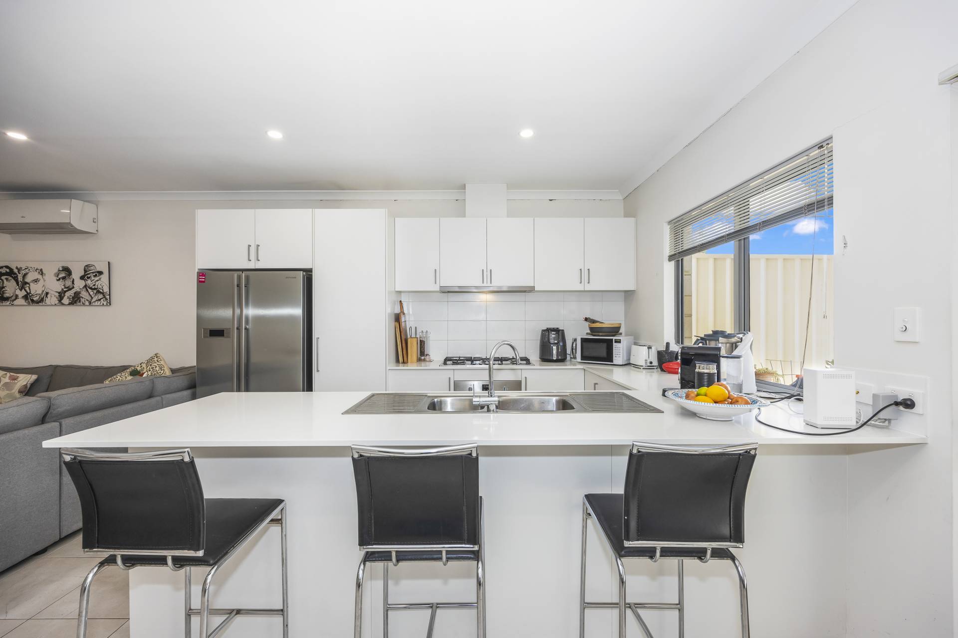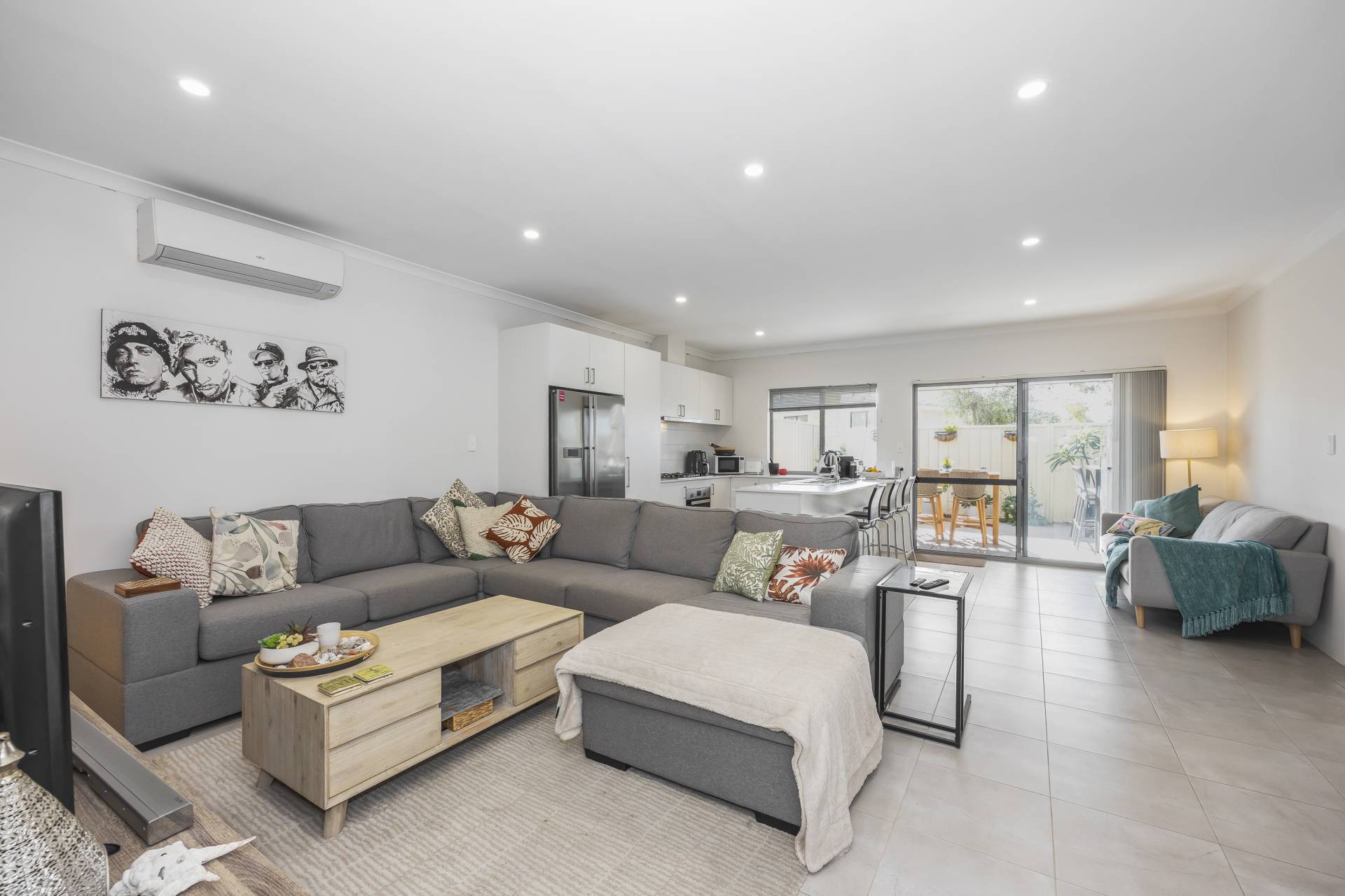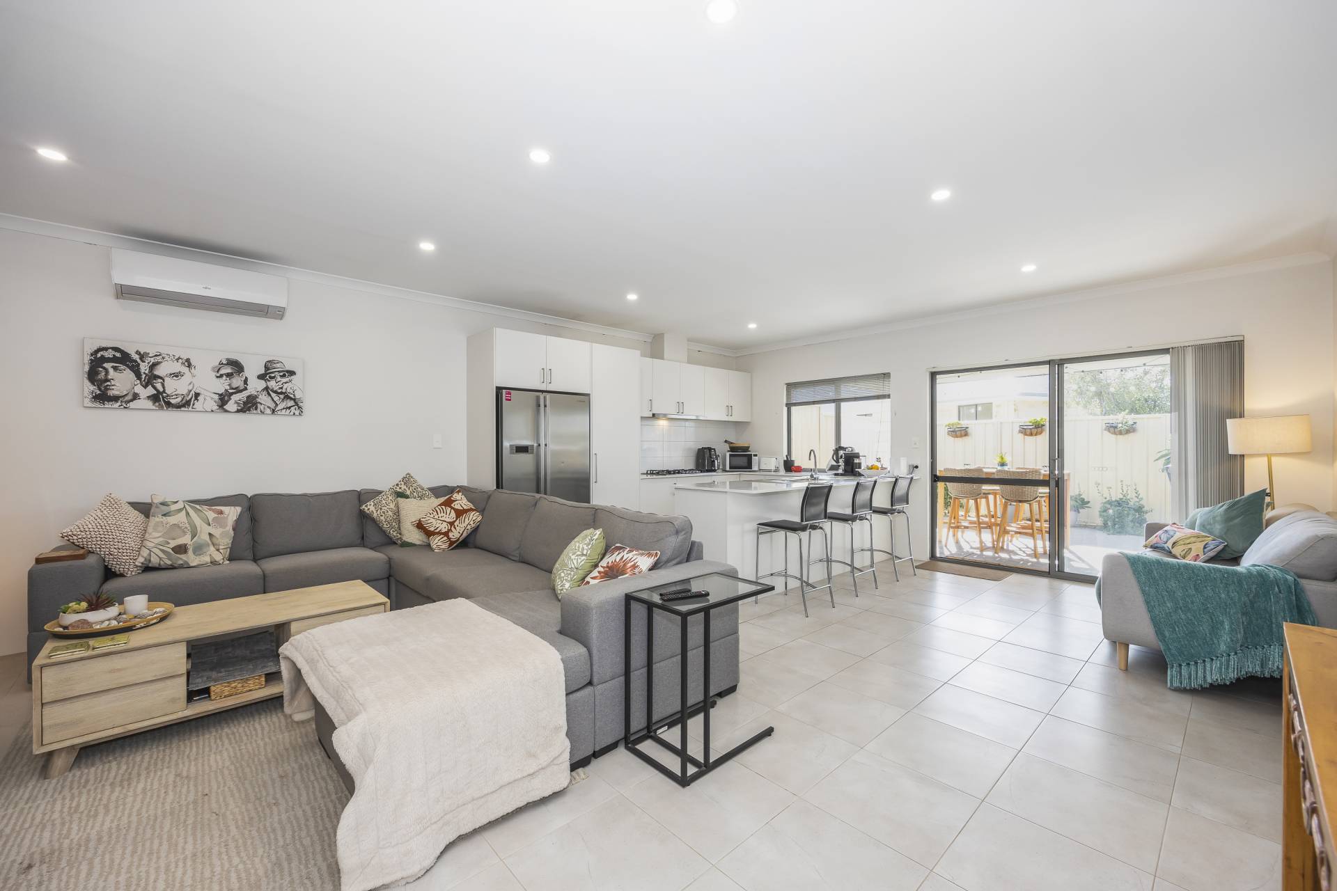 - Open plan tiled living area with high ceilings, LED down-lights and split system air conditioner.