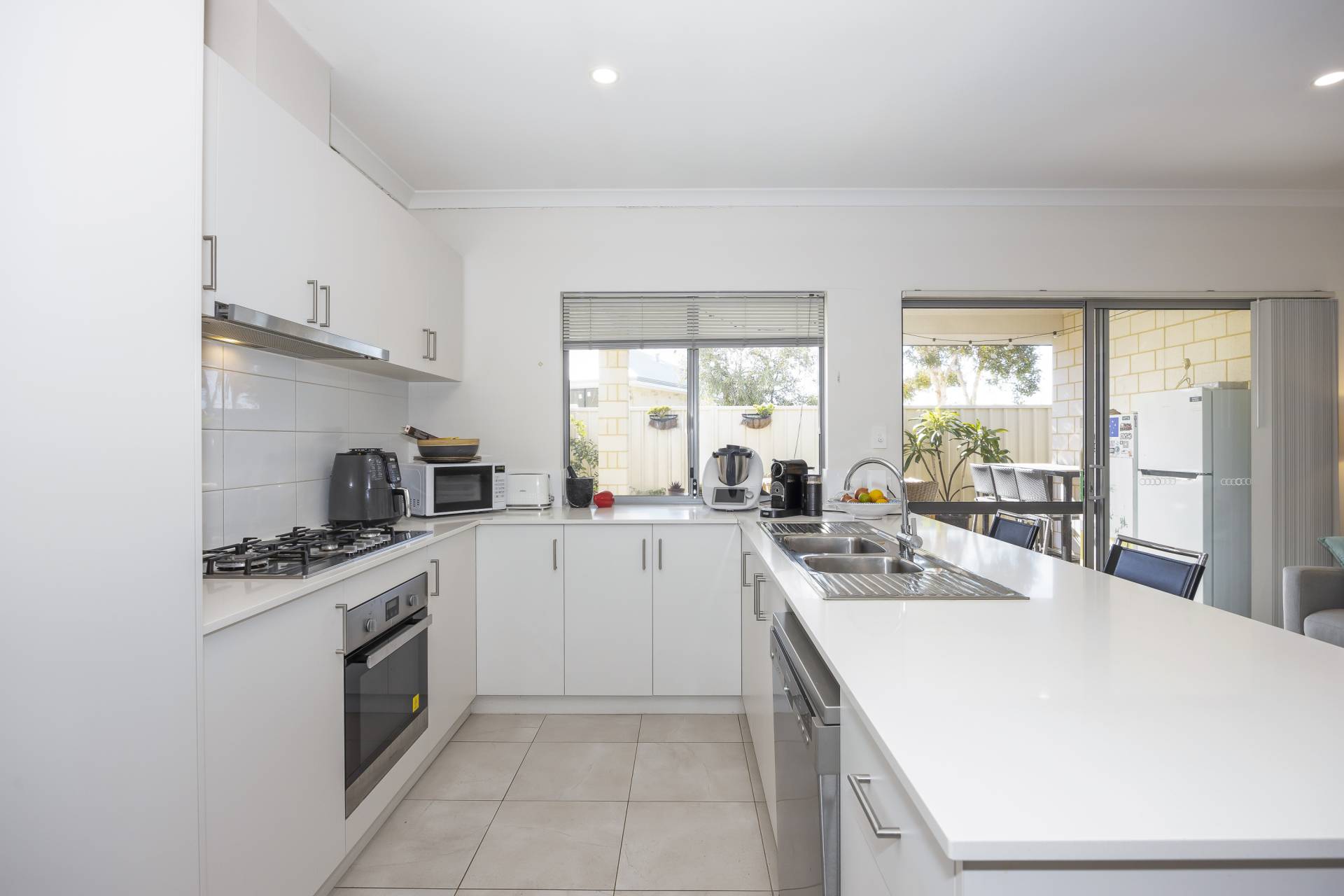 - Kitchen with stone bench tops, ample cupboard space, stainless steel appliances, and room for a dishwasher.