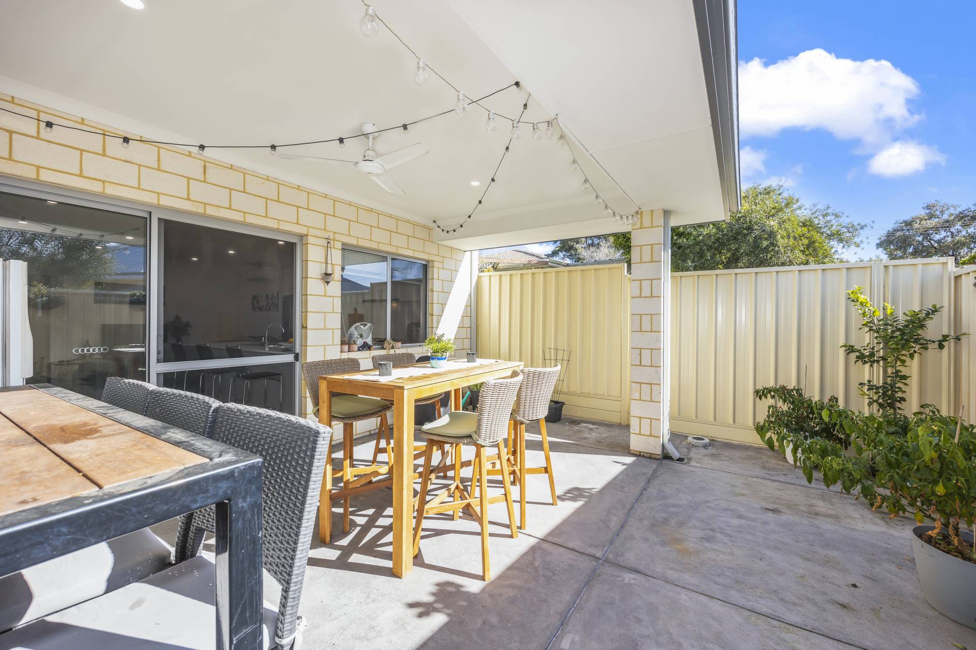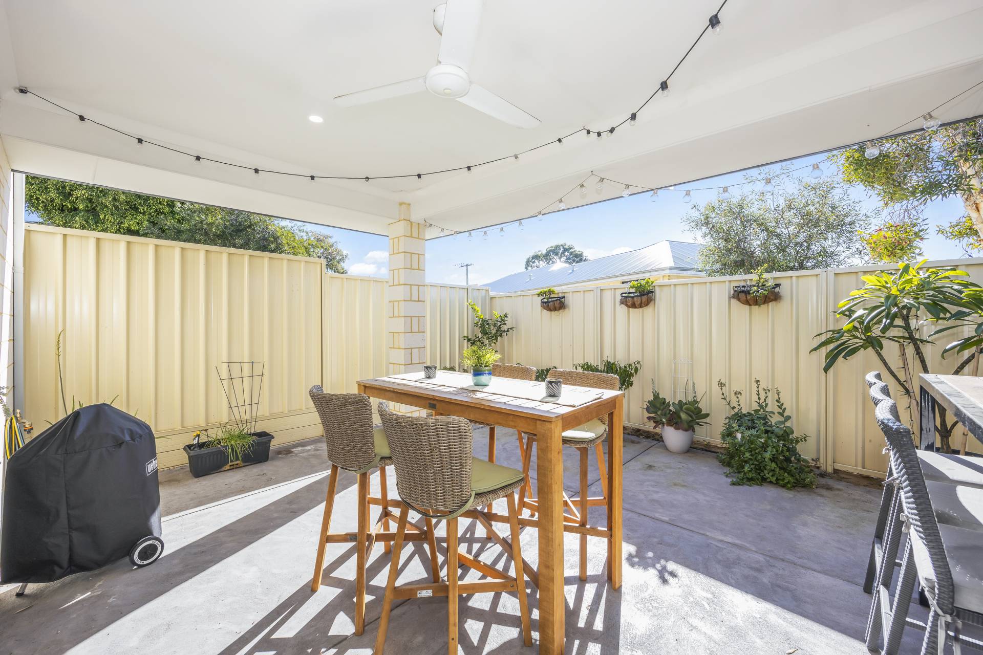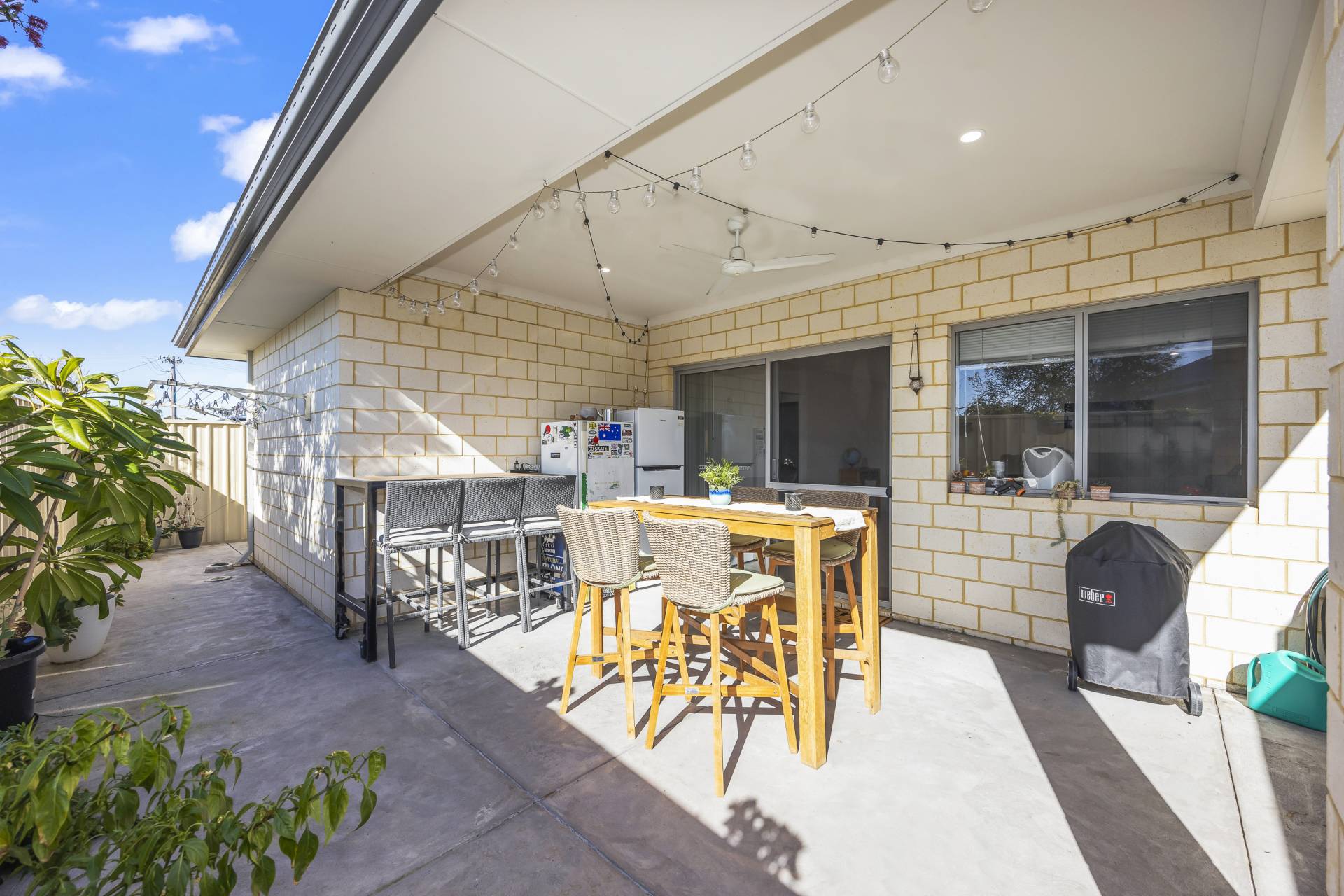 - Paved alfresco extra with built in ceiling fan and low maintenance gardens.